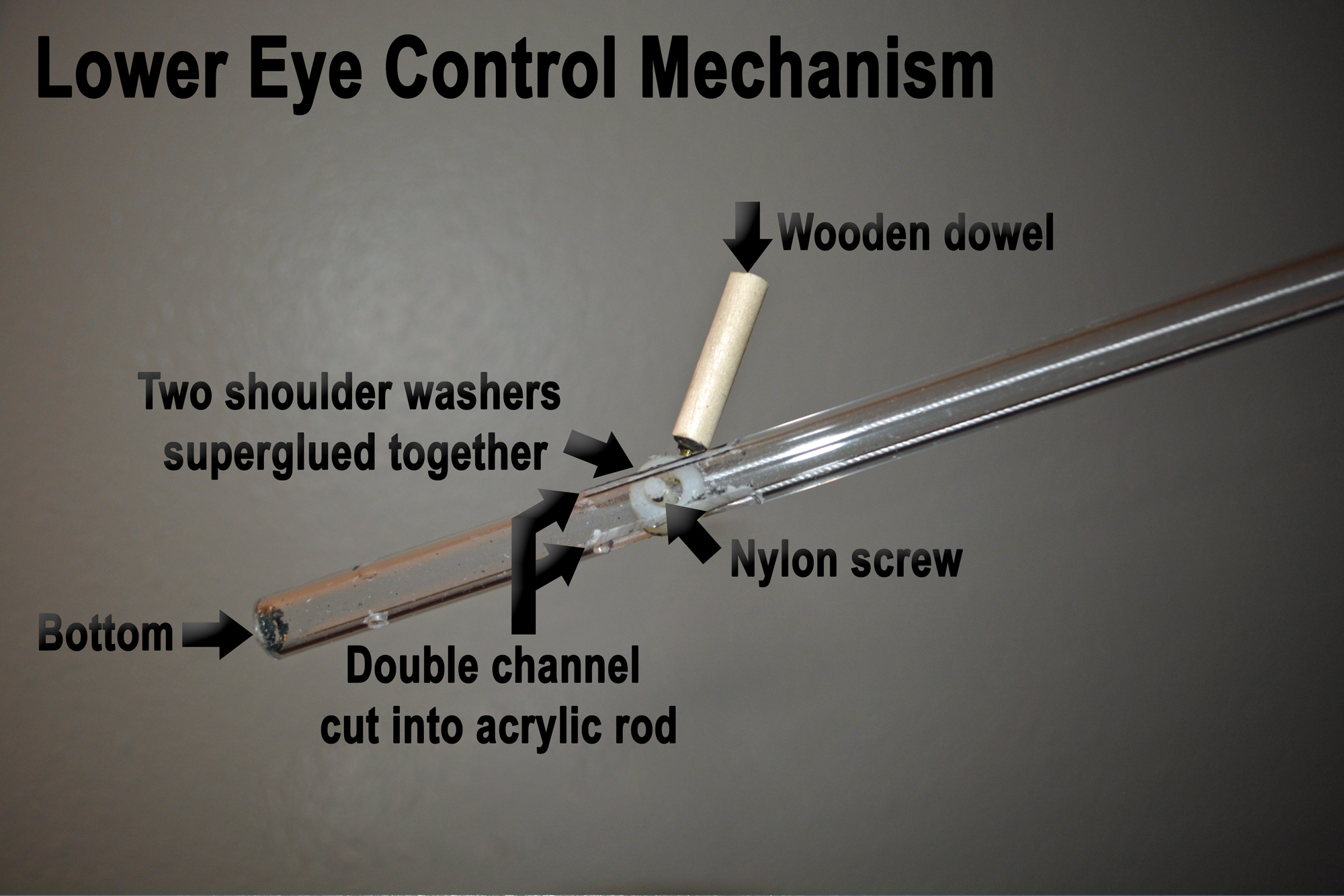 To keep the eye control mechanism rod from sliding up and down when you're using Crow, go down to the bottom of the rod and drill a half-inch screw through the Schedule 40 PVC into the eye control rod (see photo). Since we want Crow's eyes to be articulated, you'll have to widen the hole in the PVC into a track so you can turn the eyes back and forth even when the screw is in it. Mine is about 3/4" wide.