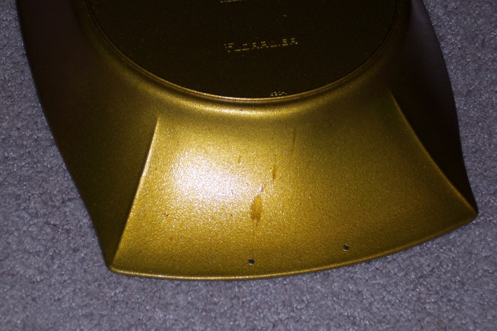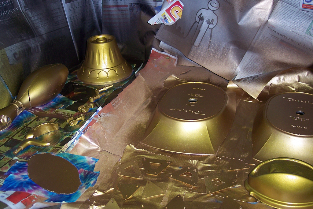 After painting the dark parts with semi-gloss black paint, mask off the appropriate sections of the soapdish and mouth and go to work with Krylon Gold.