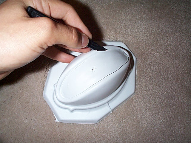 6. Going back to the soapdish, drill a 7/8" hole centered for the PVC pipe to fit through. You'll also want create a backplate for the soapdish. Take some spare styrene sheet plastic and trace an outline of the dish onto it and then cut it out.