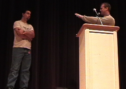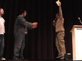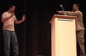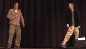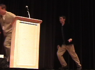 One of the questions near the beginning was if anyone knew where the Real Estate conference was (a joke.) Mike then offered to fight the fan for such an insult and the fan chased Mike off-stage. |
